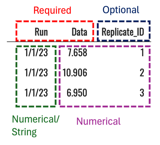 3. The required column Data must only contain numerical values. This means that there can be no letters included in any of the data values. Additionally, please do not use any other special characters other than minus signs and decimals. If there are values of Not a number (NaN) in your dataset, set those to blank instead. Examples are included below of what does and does not constitute numerical values for the purposes of this application.