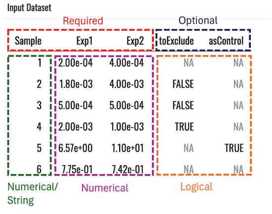 1. For the Optional toExclude and asControl columns, make sure that the values entered into these columns are logical. Specifically, for a given row, only write the words: TRUE or FALSE. It is also acceptable to not write anything at all. For example, if you are selecting samples to be excluded, write the word TRUE in the rows you want to exclude under the toExclude column. For all other rows in the toExclude column, keep them blank or write the word FALSE.